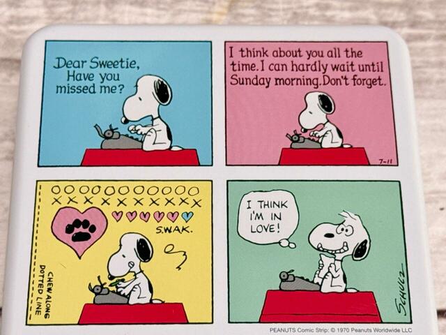 前面には、ルーシーにキスをするスヌーピー、背面にはハートを飛ばすラブラブなスヌーピーのイラスト入り。リバーシブルで異なるデザインを楽しめるのもうれしいポイントです。