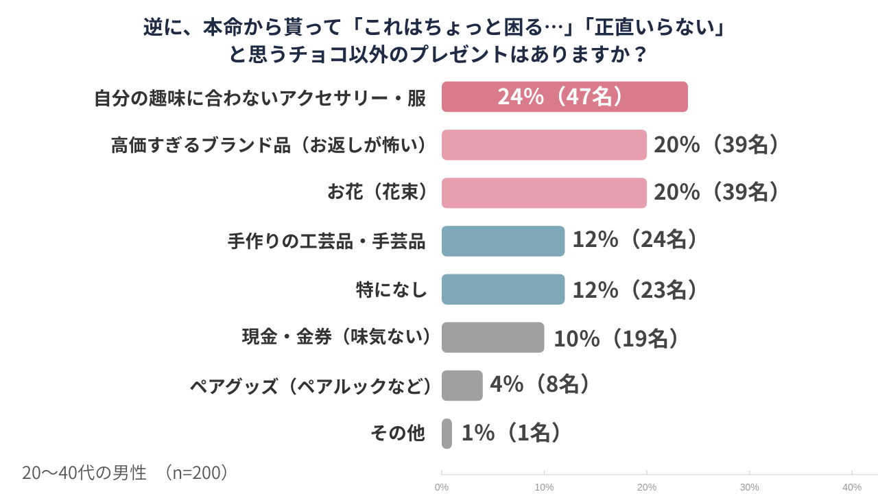 最も多かったのは「自分の趣味に合わないアクセサリー・服」で24%となりました。次いで「高価すぎるブランド品」や「お花」がいずれも20%と続いています。