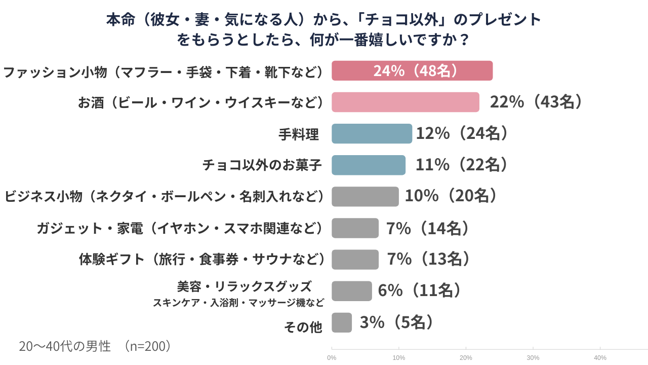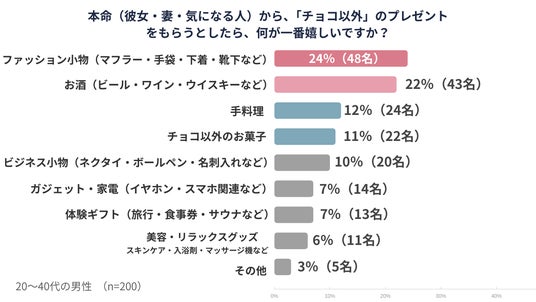 本命(彼女・妻・気になる人)から「チョコ以外」のプレゼントとして最も多かったのは「ファッション小物」で24%となりました。次いで「お酒」が22%、「手料理」が12%と続いています。