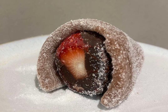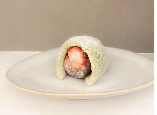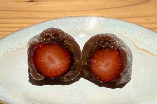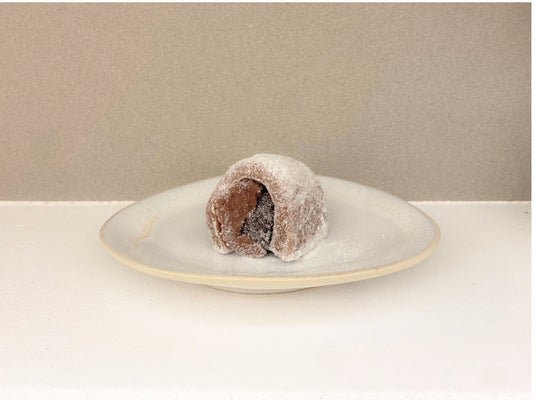 バレンタイン八衣では、ココアを練り込んだ求肥を使用し、中には、チョコレートでコーティングしたいちごと、秋田県産いちじくを丁寧に炊き上げた甘露煮を包み込みました。いちごの軽やかな酸味と、いちじくの凝縮された甘みが、ココア求肥のやわらかな食感とともに広がります。