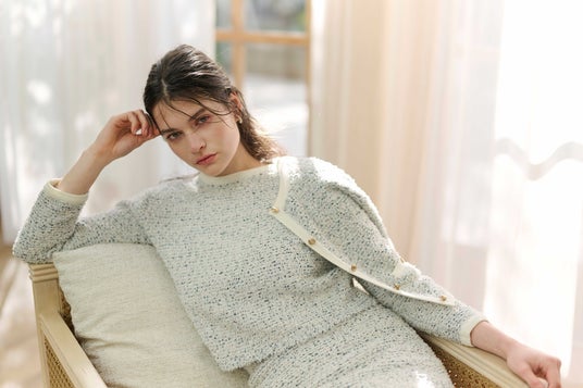 春夏の第一弾となるヴィジュアルLOOKでは、華やかなツイードのジャケットやクードシャンスらしいプリントのブラウスなどが登場します。また、ピンクやブルーといったトピックカラーがアイテムを彩ります。