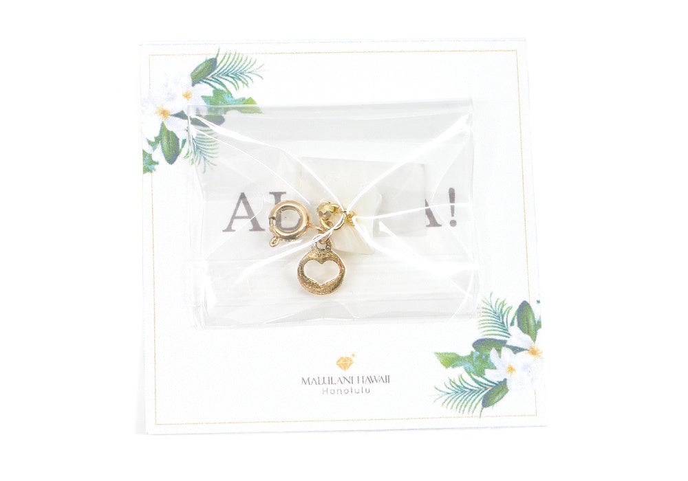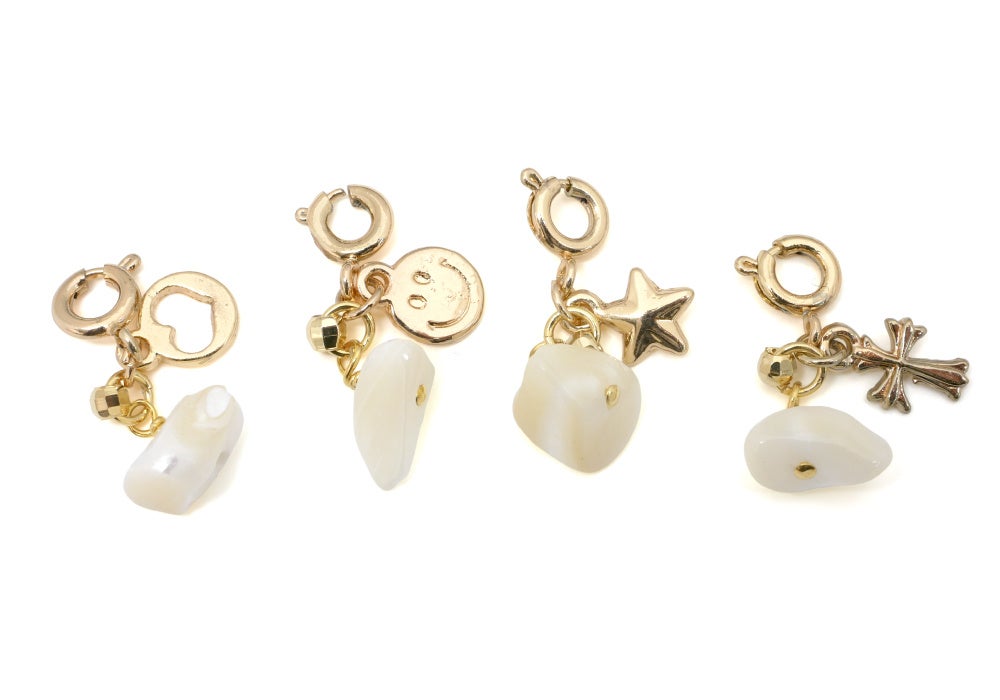 プレゼントするチャームには、やさしく上品な輝きを放つ天然石「マザーオブパール」を使用。