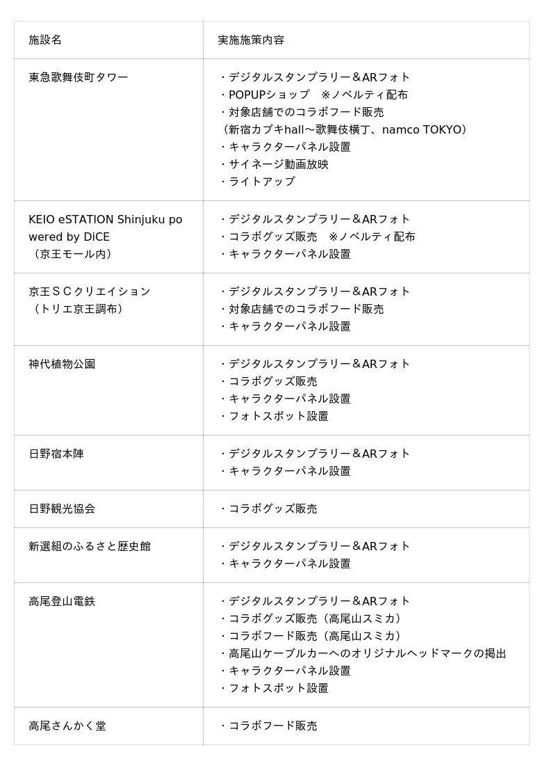 各施設ではデジタルスタンプラリーやキャラクターパネルの設置の他、描き下ろしイラスト/描き起こしミニキャライラストを使用したコラボグッズ、コラボフードの販売をいたします。また、コラボグッズの購入価格やコラボフードの注文数に応じたノベルティの配布を行います。