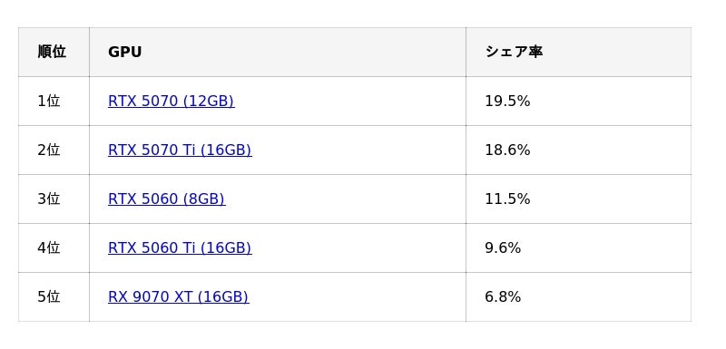 GPU別 市場動向 ― 最も注目されたのはRTX 5070 ―