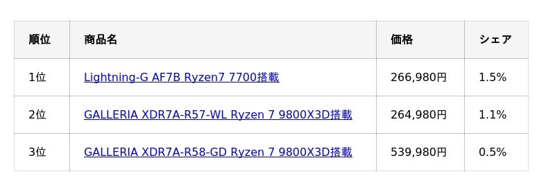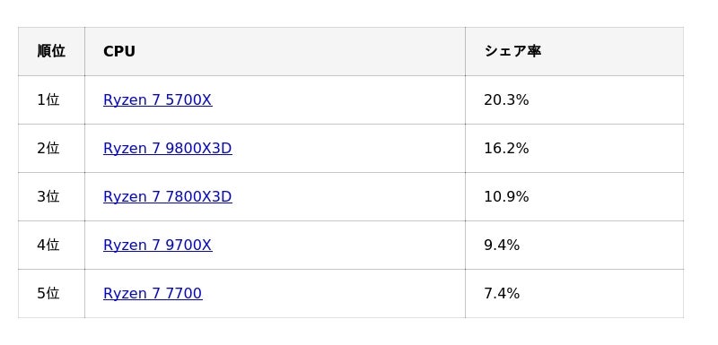 ランキング上位についても前月と同様の傾向が見られ、1位から5位までをRyzen 7シリーズが占める結果となりました。CPUに関しては、GPU分野で見られたような順位変動や閲覧傾向の大きな変化は確認されていません。