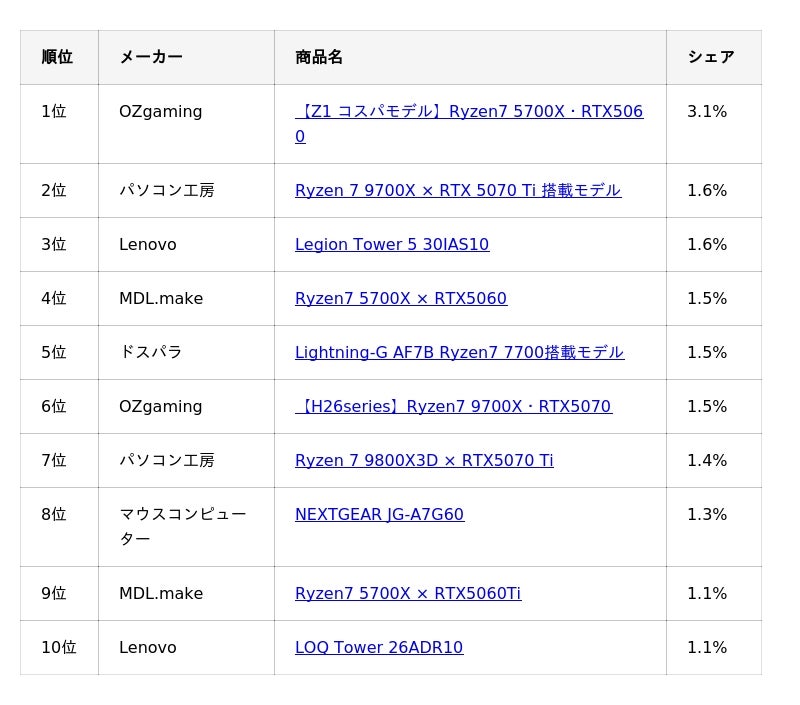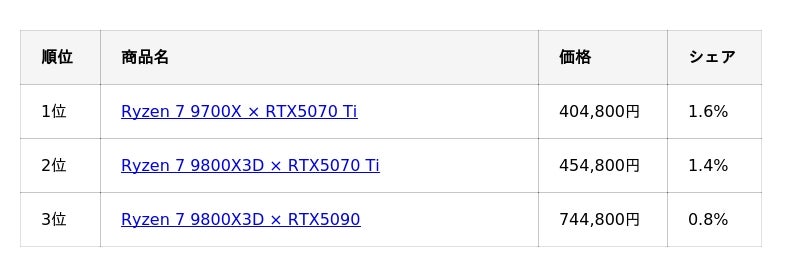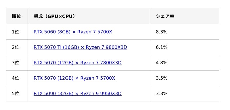 構成別ランキングを見ると、前月首位だったRTX 5070 Ti(16GB)× Ryzen 7 9800X3Dは2位となりました。GPU価格の上昇傾向を背景に、より現実的な価格帯で高い性能を確保できる構成を選択する動きが見られます。