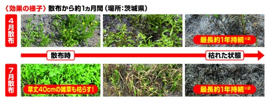 ※1草丈50cm以下の雑草での事例 ※2最大散布量を散布した場合の刈り取り不要期間の目安で、雑草がまったく発生しないということではありません。持続期間は土壌条件、気象条件、雑草の種類によって変動します。