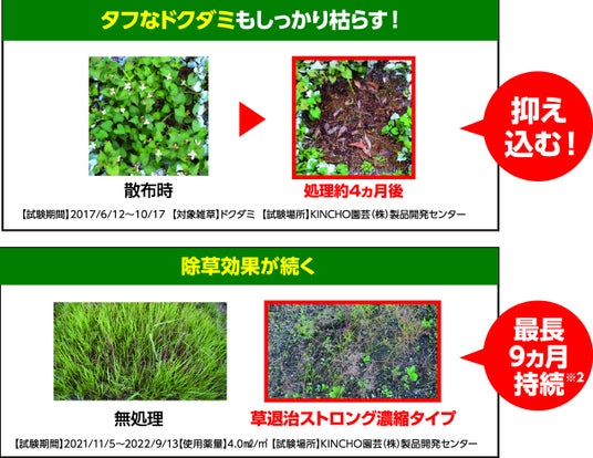 家庭園芸用薬品・肥料等を製造販売するKINCHO園芸株式会社(本社:東京都中央区/代表取締役社長:森本 義之)は、代表的な除草剤「草退治シリーズ」のラインナップとして “速効性” と “持続力” を強化し、さらに使いやすさを追求した家庭用除草剤「草退治ストロングシリーズ」を2026年1月より全国で順次販売を開始しました。雑草が生え始める春先から散布することで、長期間の予防に効果的です。
