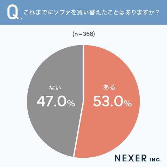 その結果「ある」が53.0%、「ない」が47.0%でした。半数以上の方がソファの買い替えを経験していることがわかります。