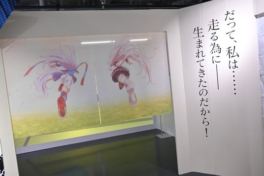 そして、歩みを進めていった先で特別映像が見られるコーナーも。こちらはオグリキャップの蹄跡(あしあと)を辿るようなものとなっており、このイベントのためにアニメの映像を編集して制作されたものなのだとか。新規ボイスが聴けるそうなので、来場の際は立ち止まってチェックしていきましょう。