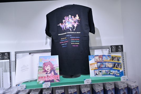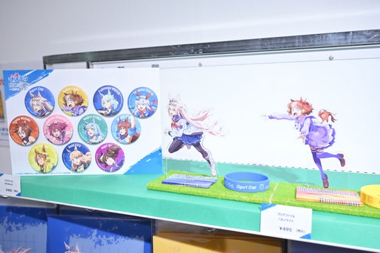 物販コーナーではオグリキャップやタマモクロスだけでなく、アニメ『ウマ娘 シンデレラグレイ』に登場した各ウマ娘の様々なグッズが販売中。アクリルスタンドやクリアファイルといった定番アイテムはもちろん、オグリキャップやタマモクロスの耳を再現したカチューシャキーホルダーといったユニークなアイテムもちらほら。
