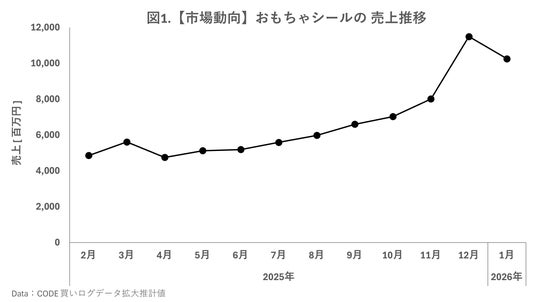弊社の保有する購買データを見ると、おもちゃシールの売上は昨夏を境に急上昇していることが分かります(図1)。これまでは特定のアニメファンや子供たちが中心だった市場ですが、最近はどうやらその域から飛び出している様子がうかがえます。
