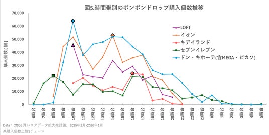 販売個数の多かった上位5チェーンを確認すると、購入個数のピークは1日に2回ありました(図5)。それは「開店直後」と「在庫補充が行われると考えられるタイミング」です。店舗を効率よく回り、本気で購入を狙うのであれば、朝8時にセブンイレブンに向かい、その足でドンキやLOFTの開店を狙います。午後は14時頃にイオンに向かい、夕方16時頃にキディランド…というなかなかハードではありますが、このルートが良さそうです。「そこまではちょっと……」というライト派の方は、開店直後10時台と、多くのチェーンで在庫補充が多い14時台に絞って近場を覗いてみるのがおすすめです。