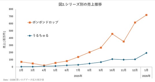 数あるシールの中でも、「ボンボンドロップシール」(以下ボンボンドロップ)の存在感は突出しています。次に売れている「うるちゅる」シリーズと比較しても差は大きく、ブームの主役といえる状況です(図2)。立体的で映えるビジュアルがSNSと相性抜群で、人気キャラクターとのコラボも追い風となったと考えられます(図3)。