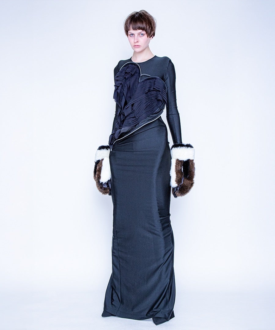 本会期ではブランドのアーカイブから厳選した8着のイブニングドレスを展示・受注販売いたします。フランスのオートクチュールメゾンでの経験を基に作り上げた、300回を超える手作業による裁断を施したフリンジや、立体的なエンブロイダリー、繊細なフェザー装飾、そして最高級シルクが生み出す彫刻のようなシルエット。高度な手仕事の結晶とも言えるドレスを間近でご覧いただけます。ブランド立ち上げからバイヤーと信頼関係を築いてきたことを背景に、一般向けとしては初となる受注会が実現しました。
