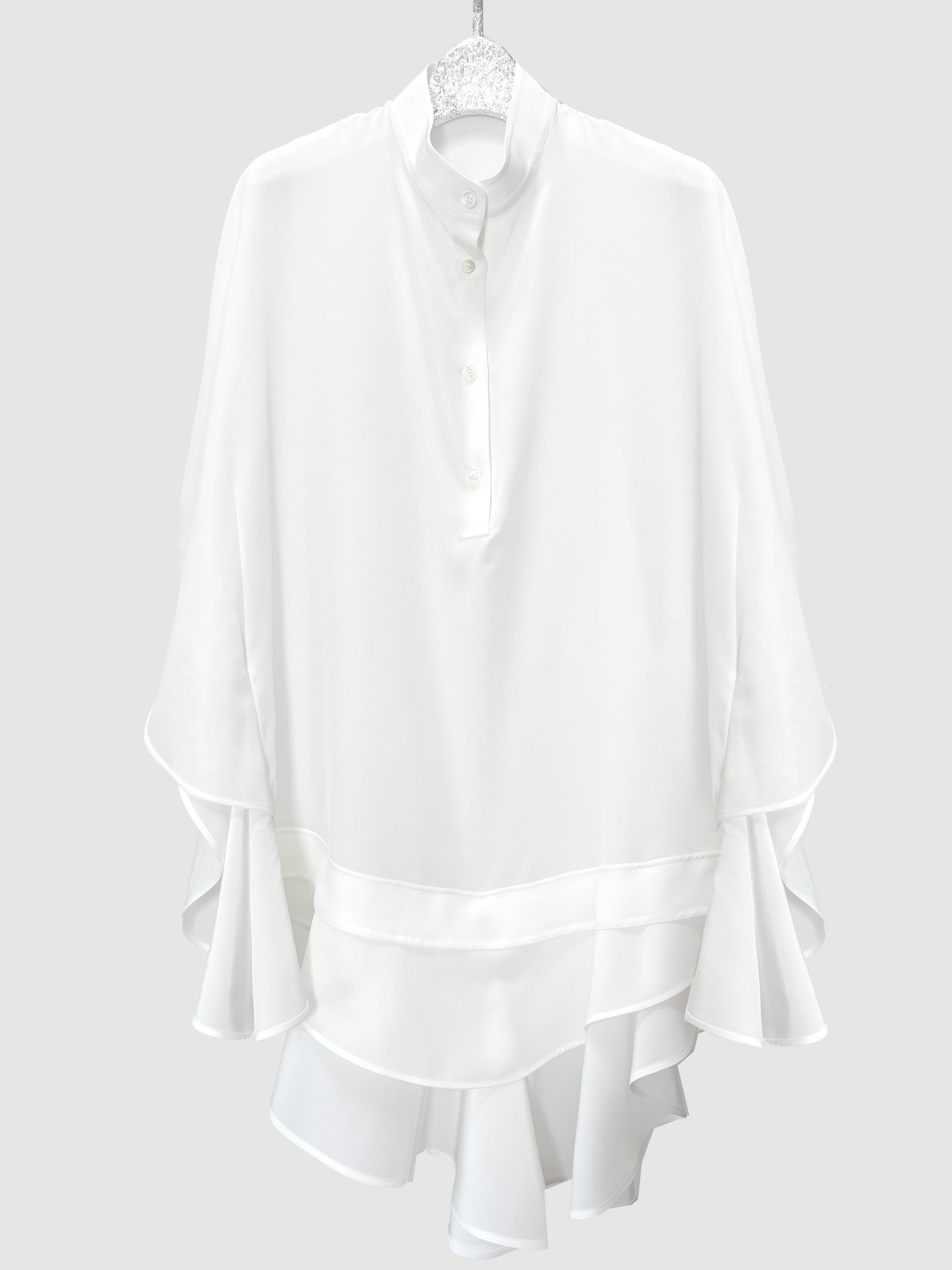 彫刻家アレクサンダー・カルダーの「動く彫刻・モビール」が着想源。GURTWEINの軸となっている高度なヨーロッパスタイルのテーラリングをベースに、軽さと透け感、空気のような軽快なラッフル、比重の異なる素材の組み合わせを織り交ぜています。所作によって表情を変えるシルエットなど、洋服を着る楽しさや高揚感を引き立てます。
