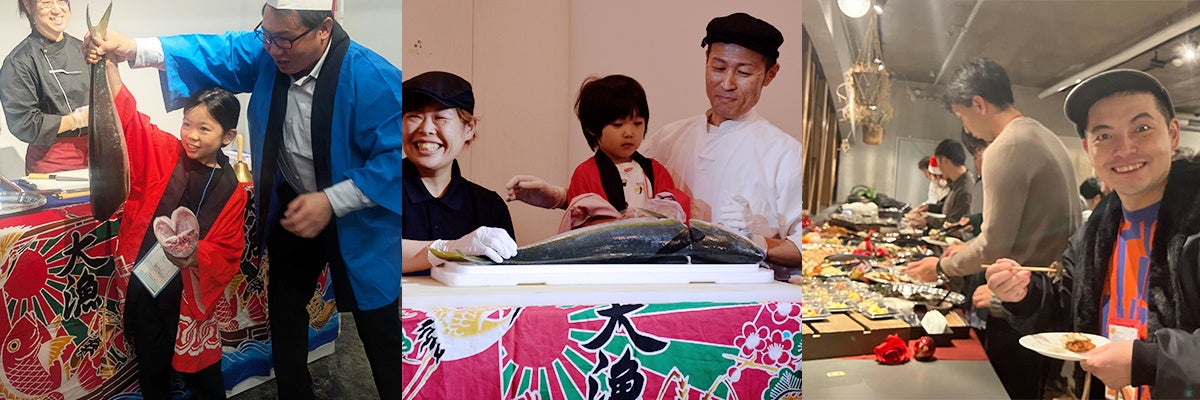 イベントスペースを貸し切り、手づくり感のあるおもてなしを大切にしました。目の前で行われるブリの解体ショーは大きな盛り上がりを見せ、参加者同士の距離も一気に縮まり、会場全体に一体感が生まれました。