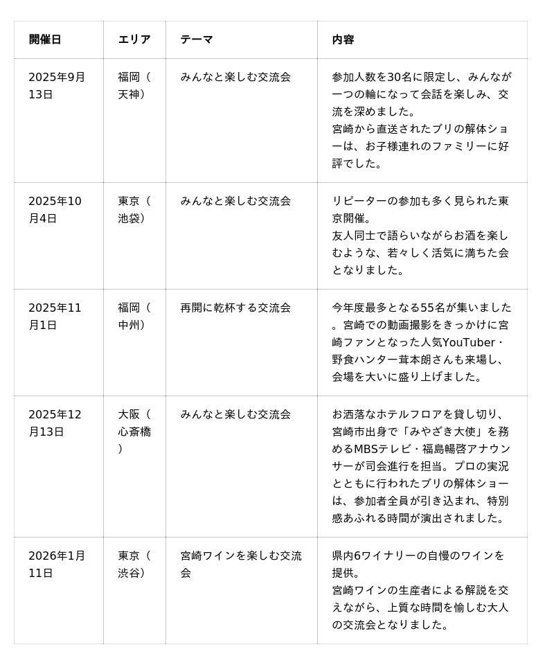 イベント後のアンケートでは、「今後も宮崎と関わり続けたい」「応援していきたい」といった声が多く寄せられ、宮崎への愛着が育まれている様子がうかがえました。今後も、宮崎県外に暮らすファンと宮崎を結ぶ機会を創出し、関係人口の広がりを目指してまいります。