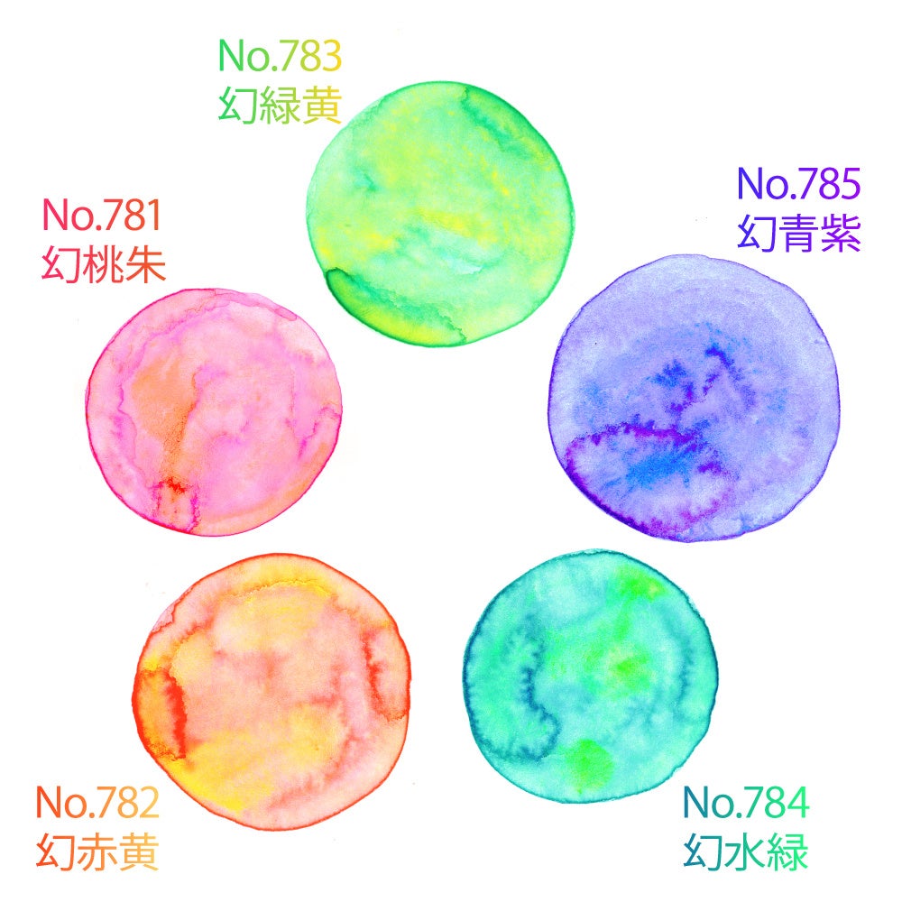 カラーバリエーションは、幻桃朱(げんとうしゅ)、幻赤黄(げんせきおう)、幻緑黄(げんりょくおう)、幻水緑(げんすいろく)、幻青紫(げんせいし)の5色、水溶きに便利な空容器が1つ付属しています。イラストレーション、ブラッシュレタリング、カリグラフィー、書画など、あらゆるアート作品にご使用いただけます。