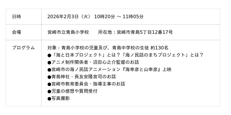 ◆上映会:2026年2月3日(火)10時20分 ~ 11時05分 場所:宮崎市立青島小学校 ◆表敬訪問:2026年2月3日(火)14時00分 ~ 14時30分 場所:宮崎市役所 市長室