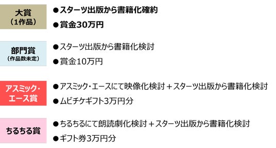 大賞受賞作はスターツ出版より書籍化確約、アスミック・エース賞は映像化検討、ちるちる賞は朗読劇化検討予定です。