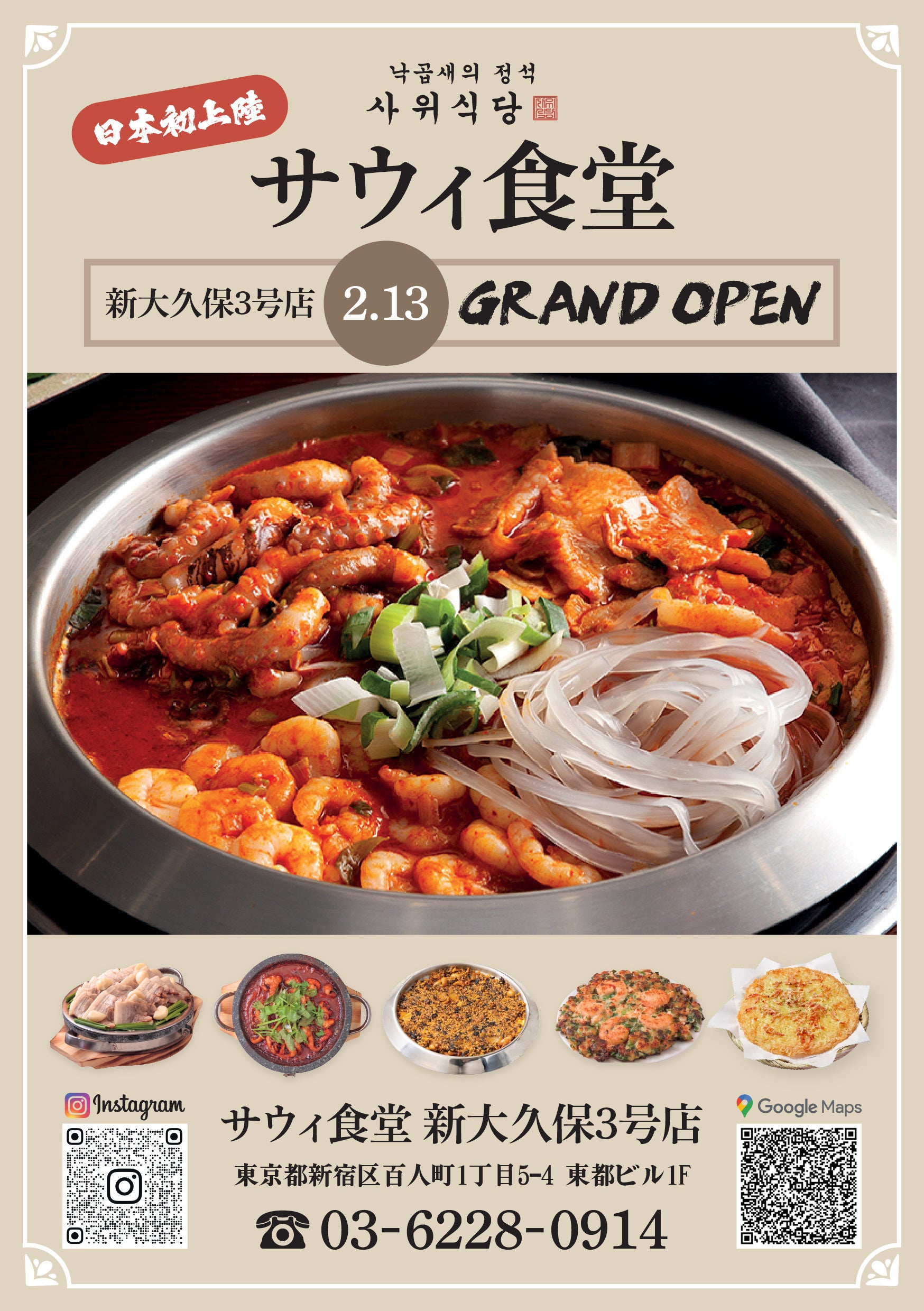 韓国No.1のナッコプセフランチャイズ『사위식당(サウィ食堂)』は、2026年2月13日に、東京新大久保に3号店をオープンすることを決定いたしました。