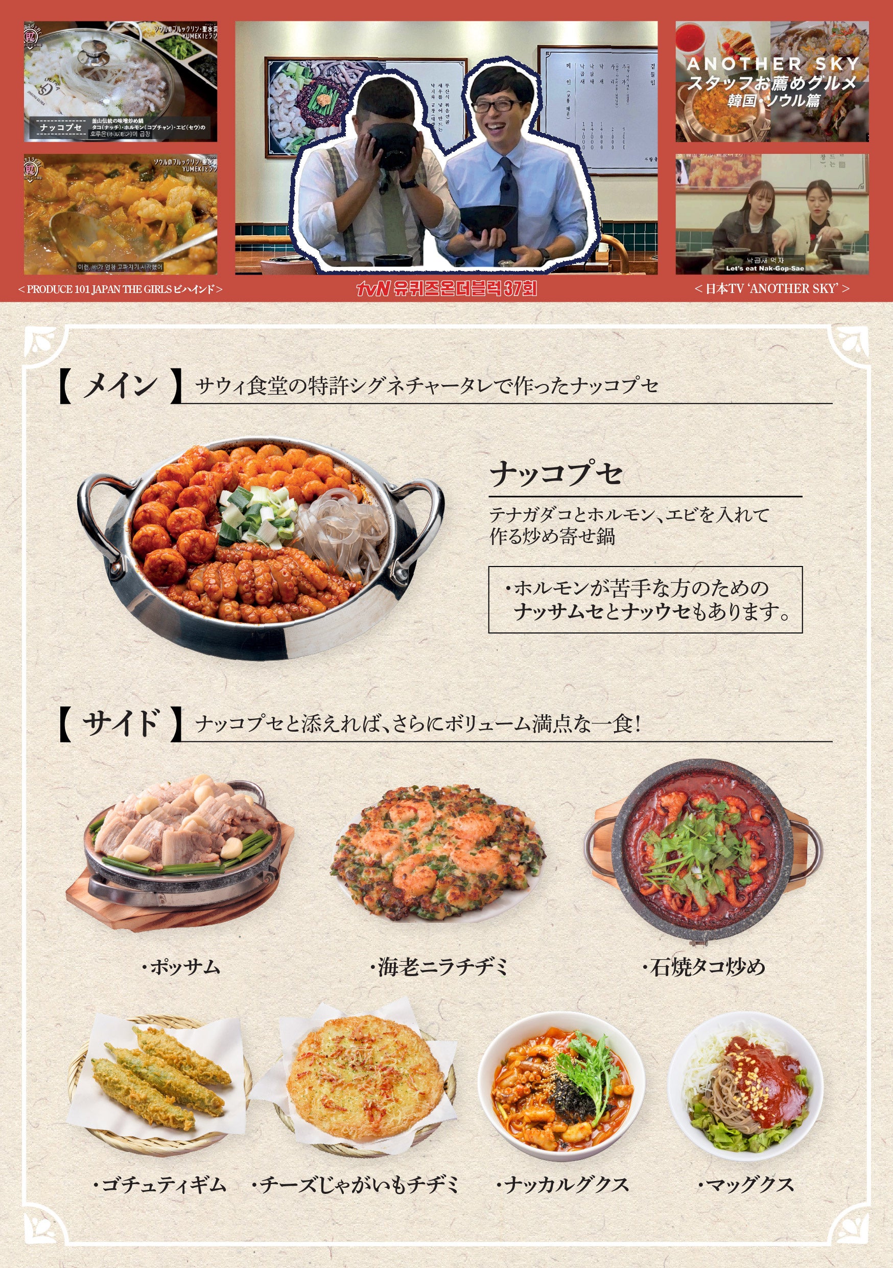 낙곱새(ナッコプセ)は낙지(ナクチ)タコ/곱창(コプチャン)ホルモン/새우(セウ)エビの頭文字を取ったことが由来の、韓国釜山発祥の郷土料理です。サウィ食堂は、韓国で30店舗以上を展開しており、フランチャイズとしては業界トップに位置しております。サウィ食堂の味の決め手となるタレは、17種類の食材から作られる秘伝のタレで、72時間の低温熟成を経て使用されます。日本でも韓国本場と変わらぬ味をご提供しておりますので、是非自慢のナッコプセを召し上がっていただければ嬉しいです。