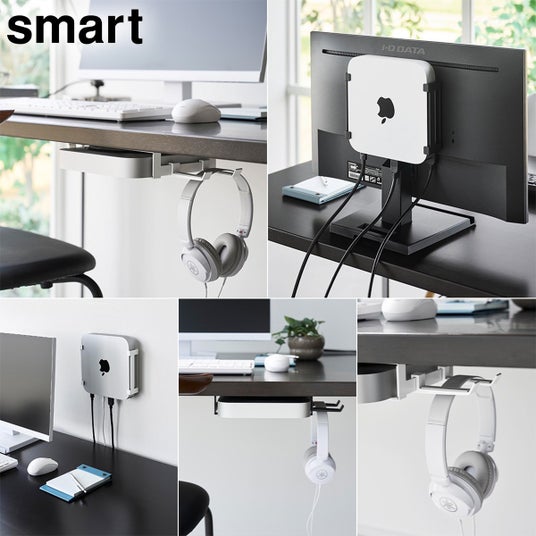 対応する小型PCを、モニター背面・デスク下・壁面の3通りで収納できるラックです。