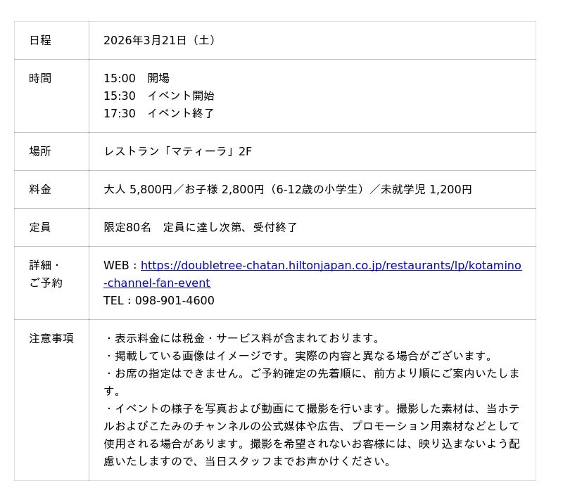 【2026年2月6日】ダブルツリーbyヒルトン沖縄北谷リゾート(北谷町美浜(ちゃたんちょうみはま)、統括総支配人 宍倉裕(ししくらゆたか))は、2026年3月21日(土)に、登録者数476万人を誇るYouTubeチャンネル「こたみのチャンネル」のファンイベントを開催いたします。