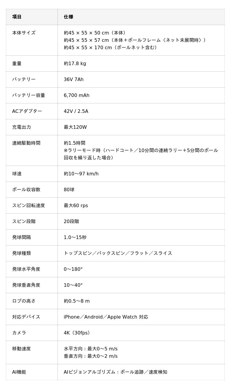 ※ 2026年1月時点、自社調べ。 量産・市販されているテニス練習機を対象とした比較調査に基づく。自走してラリー練習を行える機能を備えた市販ロボットとして。