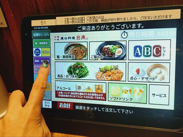 席に案内してもらい、食べ飲み放題のコースをタッチパネルにて注文。すると画面が専用ページに切り替わり、オーダーができるようになります。