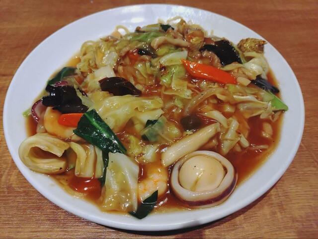 しかし、やってきた「五目あんかけやきそば」は、私の想像を遥かに超えたボリューミィさでした。しかし、具がたっぷりのあんかけが細麺に絡んで美味しさは文句ナシ!