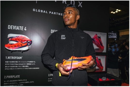 プーマは会場内にブースを設け、競技者や観戦者が気軽に立ち寄れる体験型の空間を展開しました。ブース内では、応援用チアボードやタトゥーシールの配布、フォトブースを実施し、レースを観る・応援する楽しさを共有する場として多くの来場者で賑わいました。また、ブース内では発売に先駆けて、初のHYROX仕様の競技用シューズ「DEVIATE NITRO(TM) ELITE HYROX(ディヴィエイト ニトロ エリート ハイロックス)」を展示。ランニングとファンクショナルトレーニングを繰り返すHYROX競技の特性を想定したモデルとして、来場者の関心を集めました。