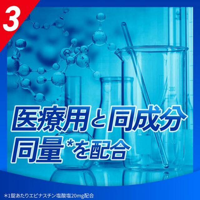 第2世代抗ヒスタミン成分「エピナスチン塩酸塩20mg」を最大量配合。ヒスタミンなど原因物質の作用を阻害し、放出自体も抑制するため、症状の発現から悪化までを多面的にブロックします。