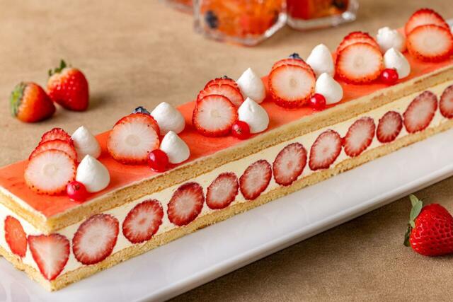 また、カスタードとバタークリームを合わせたクリームと、アーモンドプードル入りの風味豊かな生地に、苺の酸味が調和したフランス伝統のケーキ「フレジエ」は、苺の美しい断面は必見!