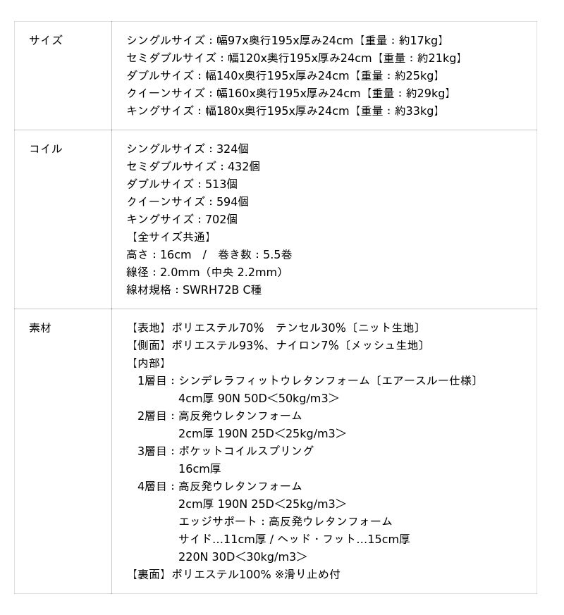 各層が連動することで、包み込まれるような心地よさと、身体をしっかり支える安定感を両立した寝心地を実現しています。