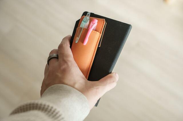 これまでは、適当にメモ帳に挟んでペンを持ち歩いていましたが、見た目もよくないし、移動中に外れてどこかへ行ってしまうことも多々……。