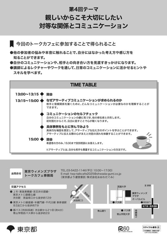 【 イベント名 】 東京ウィメンズプラザトークカフェ第4回