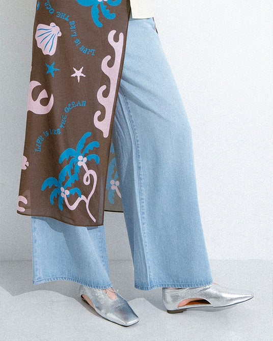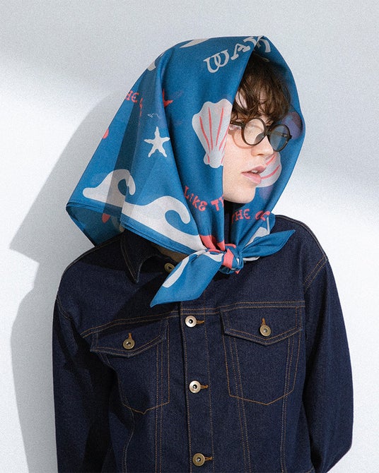 海やビーチの風景をモチーフに描かれたポップで遊び心のあるイラストが目を惹くスカーフ。