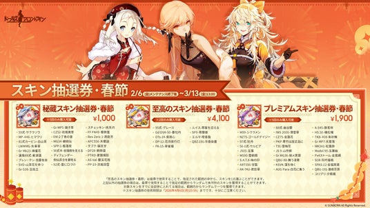 「2月6日(金)メンテナンス後」より、様々なチャイナドレススキンが入手できる「スキン抽選券・春節」を期間限定で3種類発売いたします。プレミアムと秘蔵は使用することで指定のスキンからランダムで入手可能。