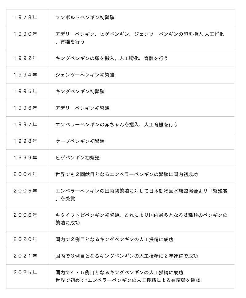1978年の開園時にフンボルトペンギンとキタイワトビペンギンの飼育を開始し、1990年から自然界で暮らすペンギンコロニー(繁殖群)を再現すべく、「ペンギンプロジェクト」として本格的に飼育・繁殖研究に力を注いできました。アデリーペンギン、ヒゲペンギン、ジェンツーペンギン、キングペンギンと繁殖実績を積み、1997年に世界最大のペンギン、エンペラーペンギンの繁殖研究を開始しました。<アドベンチャーワールド ペンギン繁殖実績について>