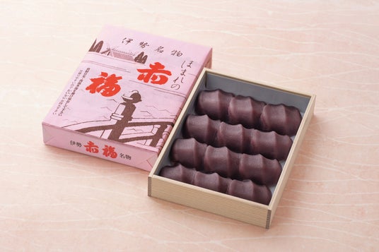 形は伊勢神宮神域を流れる五十鈴川のせせらぎをかたどり、餡につけた三筋の形は清流を、白いお餅は川底の小石を表しています。