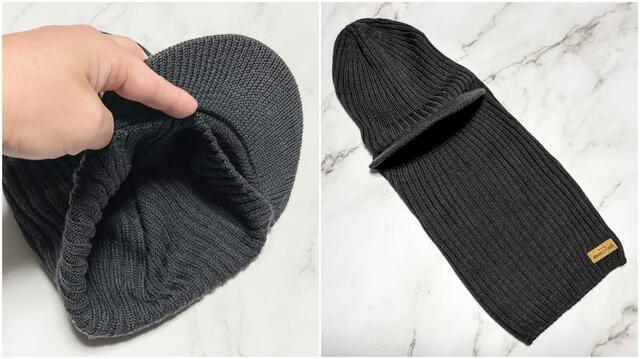 パッと見は普通のニット帽のようですが、内側にたたみ込まれた部分を引き出すことでバラクラバ(目出し帽)に早変わりするんです。