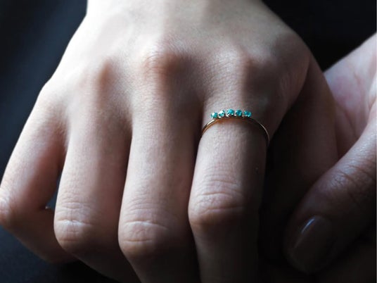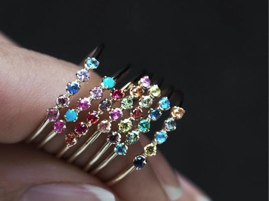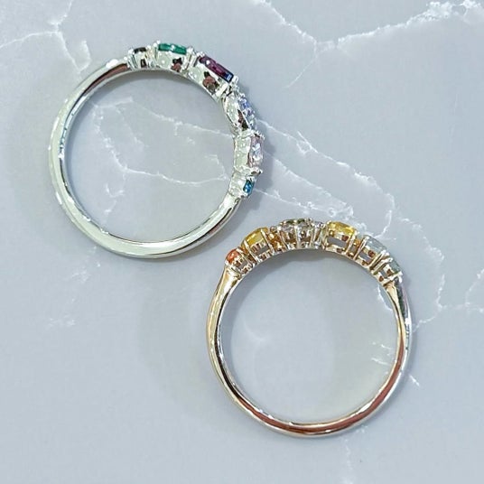 小粒の宝石を等間隔に据えることで、指元に穏やかな色彩の連なりをもたらします。色の組み合わせは一点ごとに異なり、同一仕様でも印象が重なりません。