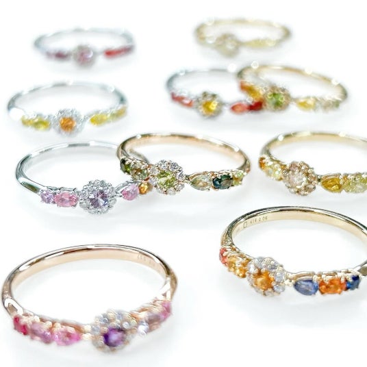 取り巻きのメレダイヤモンドとの組み合わせにより、同じ6mmサイズでもセンターストーンの種類によって印象が大きく異なります。ソリッドカラーからマルチカラー、カボションカットまで、仕立ての違いによる表情の幅も特徴です。