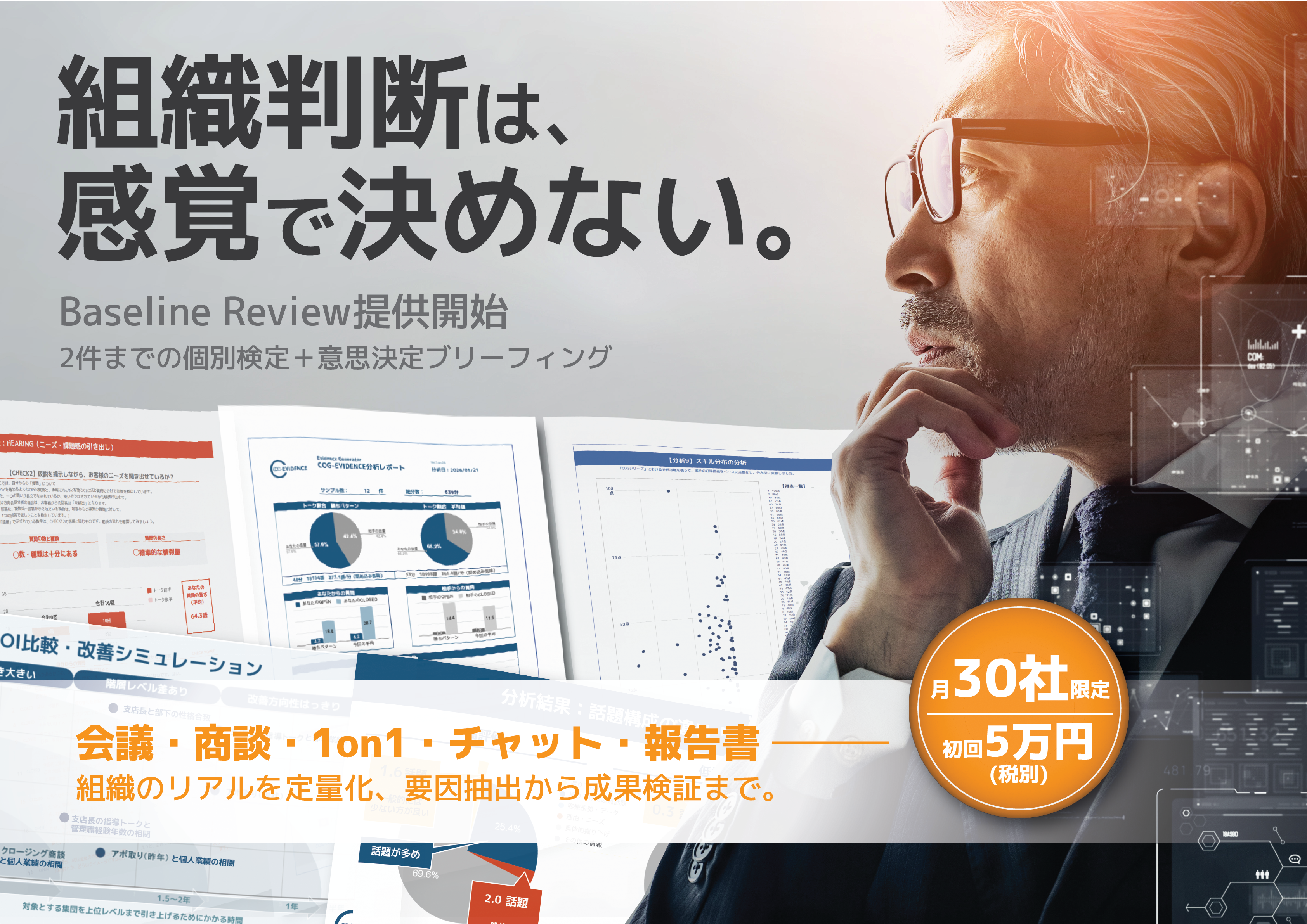 その入口として、短期間で現状の課題と改善の方向性を把握できる「Baseline Review(お試し)」を5万円(税別)で1月27日にリリースいたしました。個人・組織の力量を確かめるため、パフォーマンスが良いトーク/悪いトークの違い(構成・論点の置き方・説得の流れ等)や最終版の再レビュー(Before/After比較)として、録画・音声・書類等を2本ご提出いただくことで、分析結果とブリーフィング1時間でフィードバックします。(個人利用の場合は、ブリーフィングに代わりメールもしくはオンラインセミナーにて実施)