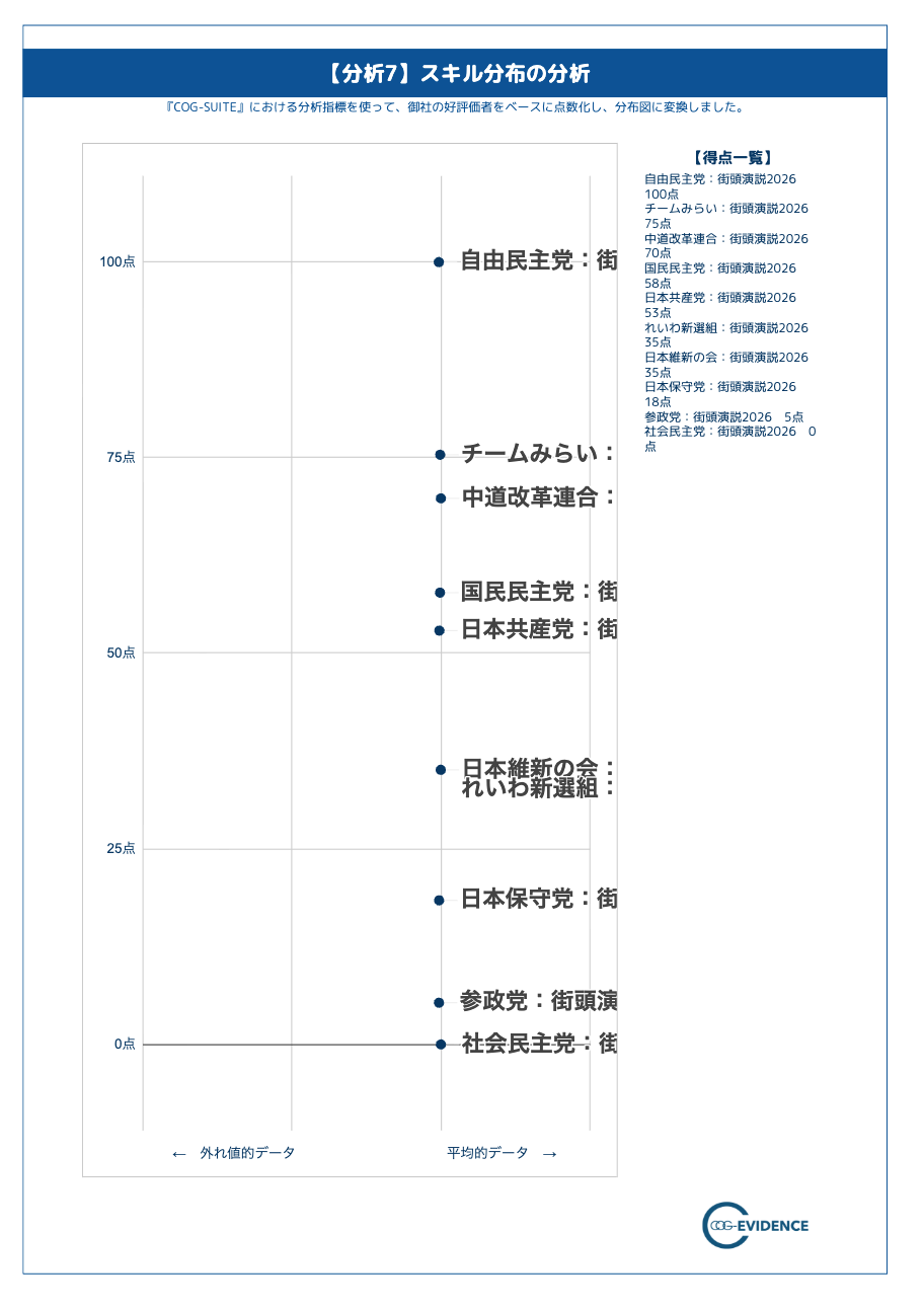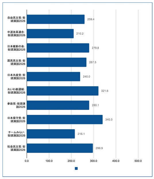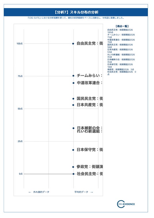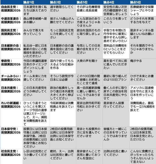 知識表現AIを用い、会話・文章情報から組織課題を可視化するコグニティ株式会社(本社:東京都品川区、代表取締役:河野理愛、以下「コグニティ」)は、2026年2月8日投票日の衆院選に向けて、各党の街頭演説(10党・全419分)を対象に、主張の“中身”だけではなく、伝え方の“型”を定量化する分析を実施しました。