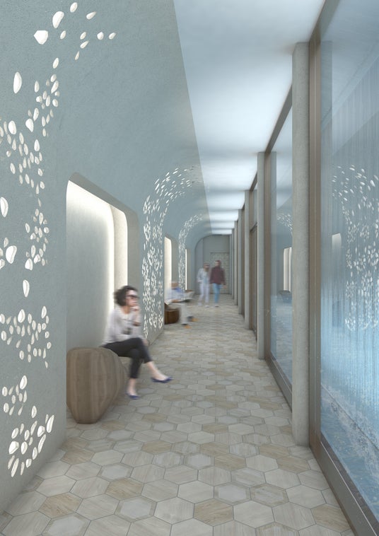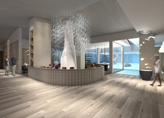 刻一刻と表情を変える支笏湖。その湖面が最も美しい「白」と出会うのは、月の光が湖面にまっすぐ降り注ぎ、世界をやわらかな光で包む瞬間です。私たちはその幻想的な光を「レイクホワイト」と呼び、館全体の基調色としました。支笏湖の自然をモチーフにした水と光のアートが館内を彩り、湖が見せる無限の変化と静寂を、シンプルで透明感のある空間に映し出しています。