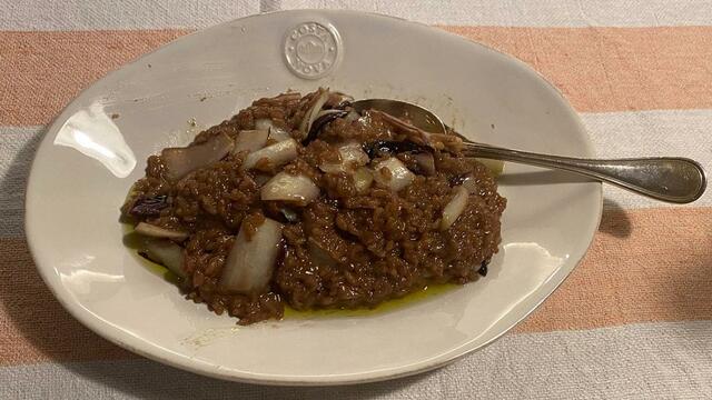 メインディッシュはラディッキオ・タルディーヴォの赤ワイン入りリゾット。REGALO/小倉さんのレシピです。今日もまたアイデア拝借しました。ありがとうございます。最後にざく切りした生ラディッキオ・タルディーヴォを載せたら、より美味しくなりまして、ブラヴォー!!!なのでした。