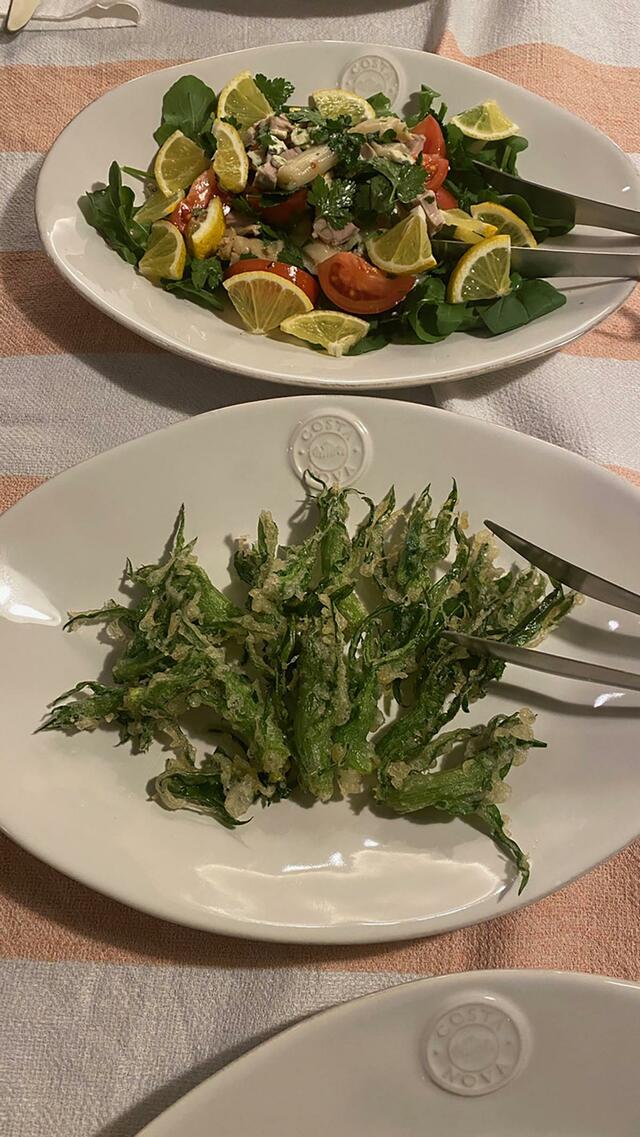 プンタレッレのフリット、サラダ(白アスパラガス、トマト、イタリアンパセリ、湘南ゴールド、ルッコラ)、